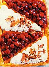 Sauerrahm mit 3 Esslöffel Zitronensaft und 3 Esslöffel Zucker verrühren. Die Sahne halbsteif schlagen, unterheben. Weisse Gelatine in kaltem Wasser einweichen, ausdrücken, in einem Topf schmelzen lassen. Unter die Sahnemasse ziehen. Ca. 180 Minuten kühlen. Kirschen abgiessen, Saft auffangen. Rote Gelatine einweichen, ausdrücken. 125 Milliliter Saft, restlichen Zucker und Zitronensaft erhitzen, Früchte, Gelatine unterziehen. Kühlen. Backofen auf 200 Grad vorheizen. Aufgetauten Teig zum Rechteck (23 x 32 cm) ausrollen, auf ein Backblech setzen. Aus Teigrest Streifen für Rand und Unterteilung in Dreiecke schneiden. Mit verquirltem Eigelb aufkleben und bestreichen. Mit einer Gabel einstechen, 15 Minuten backen. Abgekühlt mit Sahnemischung bzw. Kirschen füllen und 120 Minuten kühlen.