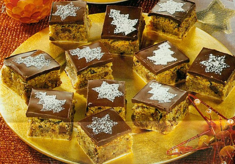 Schokolade grob hacken. Zucker, Eier, Zimt, Nelken, Mandeln, Nüsse und Speisestärke in eine Rührschüssel geben, mit den Knethaken des Handrührgerätes zu einer glatten Masse verkneten. Schokolade darunter kneten und die Masse über Nacht zugedeckt kalt stellen. Ein Backblech erst mit Backpapier belegen, dieses dann mit den Oblaten auslegen. Dabei die einzelnen Oblaten an den Rändern mit Wasser bestreichen und diese ca. 1,5 cm übereinander kleben. Die Lebkuchen-Masse mit den Händen auf den Oblaten verteilen und mit den Handflächen (klebt leider etwas) andrücken. Im vorgeheizten Backofen bei 180 Grad ca. 30 Minuten backen. Aus dem Backofen nehmen, auf ein Gitter setzen und auskühlen lassen. Kuvertüre grob hacken. Mit dem Kokosfett auf einem warmen Wasserbad schmelzen. Sofort auf den Kuchen streichen und trocknen lassen. Kuchen in Stücke (ca. 3,5 x 3,5 cm) schneiden. Weihnachtliche Motive (Förmchen oder Schablonen) mit Puderzucker darauf stäuben.