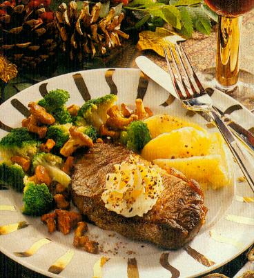 Butter mit Salz und Pfeffer verrühren, Rosetten auf einen Teller spritzen. Kalt stellen. Pfifferlinge abtropfen lassen. Kartoffeln schälen, waschen und in Spalten schneiden. Brühe und Sahne aufkochen lassen. Kartoffeln darin ca. 15 Minuten zugedeckt garen. Brokkoli putzen, waschen und in Röschen teilen. In kochendem Salzwasser 8-10 Minuten garen, kurz kalt abschrecken. Die Steaks in heissem Öl 3-4 Minuten von jeder Seite braten. Mit Salz und Pfeffer würzen, aus der Pfanne nehmen und warm stellen. Pfifferlinge im Bratfett anbraten. Sahne-Kartoffeln im offenen Topf etwas einkochen lassen, mit Salz, Pfeffer und Muskat würzen. Brokkoli zu den Pilzen geben und kurz mit durchschwenken. Mit Salz und Pfeffer würzen. Steaks, Kartoffeln und Gemüse auf Tellern anrichten. Butterrosetten auf die Steaks setzen, mit buntem Pfeffer bestreuen.