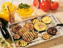 Die Auberginen in 1 cm breite Scheiben schneiden und salzen. Den Paprika-Aufstrich mit Olivenöl verrühren und die Auberginenscheiben damit einstreichen. Dann auf eine Grillpfanne jede Seite 4 Minuten grillen. Die Paprika, die Auberginenscheiben und die Tomaten würfeln, die Frühlingszwiebeln in feine Ringe schneiden. Petersilie fein hacken. Knoblauchzehe pressen. Die Zutaten für das Dressing vermischen, zum Salat geben und abschmecken.