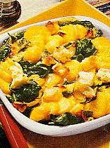 Spinat putzen, waschen, tropfnass in einem grossen Topf zusammenfallen, dann abtropfen lassen. Nudeln nach Packungsanweisung bissfest garen. Abgiessen, kalt abschrecken und abtropfen lassen. Zwiebeln und Knoblauchzehen abziehen, fein hacken. Tomaten überbrühen, häuten, würfeln. Basilikum abbrausen, Blättchen abzupfen und in Streifen, den Mozzarella in Scheiben schneiden. Zwiebeln, Knoblauch im heissen Öl andünsten. Tomaten und Basilikum zugeben. Mit Salz, Pfeffer würzen. Etwas einköcheln lassen. Den Spinat zufügen. Backofen auf 180 Grad vorheizen. Nudeln in eine gefettete Auflaufform geben, mit der Spinat-Tomaten-Sauce mischen. Mit Mozzarella bedecken. Ca. 10 Minuten goldbraun überbacken.
