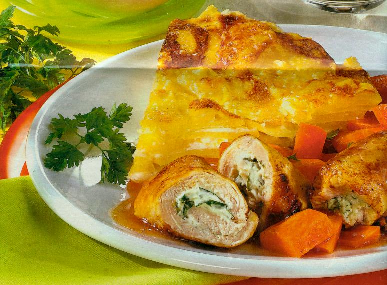 Kartoffeln schälen und in sehr dünne Scheiben schneiden. Schuppenförmig in eine gefettete Gratinform legen. Sahne und Milch verrühren, mit Salz, Pfeffer und Muskat würzen. Über die Kartoffeln giessen. Mit Käse bestreuen. Im vorgeheizten Backofen bei 200 Grad ca. 35 Minuten backen. Kräuter, bis auf etwas Kerbel zum Garnieren, fein hacken. Frischkäse mit Kräutern verrühren. Mit Salz und Pfeffer abschmecken. Hähnchenfilets waagrecht halbieren. Fleisch zwischen Frischhaltefolie dünner klopfen, mit Salz und Pfeffer würzen, mit dem Frischkäse bestreichen, aufrollen und feststecken. 2 Esslöffel Öl in einer Pfanne oder einem Bräter erhitzen. Röllchen darin rundherum anbraten. Brühe und Wein zugiessen und zugedeckt ca. 8 Minuten schmoren. Karotten längs halbieren und in Stücke schneiden. Restliches Öl erhitzen und die Karotten darin ca. 10 Minuten braten. Röllchen aus der Schmorflüssigkeit nehmen, warm stellen. Saucenbinder in die kochende Flüssigkeit rühren, ca. 1 Minute köcheln lassen. Mit Salz und Pfeffer abschmecken. Röllchen zur Sauce geben. Butter zu den Karotten geben, mit Zucker bestreuen. Unter Wenden 2-3 Minuten glasieren, mit Salz würzen. Röllchen mit Karotten und Gratin servieren. Mit beiseite gelegtem Kerbel garnieren.
