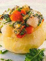 Muscheln gründlich unter fliessendem Wasser waschen. Nur geschlossene Muscheln verwenden. Wasser und Salz zum Kochen bringen, die Muscheln und geputztes Suppengrün hineingeben und ca. 15 Minuten kochen, bis die Muscheln sich geöffnet haben. Geöffnete Muscheln mit einem Schaumlöffel herausheben, geschlossene fortwerfen. Champignons putzen, waschen, in feine Scheiben schneiden. Muschelfleisch und Champignons in eine gefettete Auflaufform geben. Käse mit Wein und Sahne vermischen, bei geringer Hitze unter ständigem Rühren schmelzen lassen, mit in Wasser angerührter Speisestärke binden. Aufkochen, mit Salz, Pfeffer, Zitronensaft abschmecken, Kräuter untermischen. Sauce über die Muscheln geben, im vorgeheizten Backofen bei 220 Grad 10-15 Minuten gratinieren.