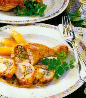 Aus den Hähnchenschenkeln wird der Oberschenkelknochen entfernt (eventuell vom Händler machen lassen). Aus Hähnchenleber, Sahne, Toastbrot, Salz und Pfeffer im Mixer eine Farce herstellen, die Hälfte der grünen Pfefferkörner unterrühren. Mit dieser Farce den Oberschenkel füllen, einige blanchierte Keniabohnen der Länge nach im Bündel in die Farce drücken und das Hähnchenbrustfilet darauflegen. Den Hähnchenschenkel nun mit einem Faden umwickeln. In Butterschmalz rundherum schön braun braten, Wasser angiessen und in 30 Minuten zugedeckt fertig garen. Hähnchenschenkel aus der Pfanne nehmen, den Faden entfernen und warm stellen. Sahne zum Bratfond geben und etwas einkochen lassen. Die Sauce mit Cognac und Salz abschmecken und die restlichen Pfefferkörner dazugeben. Zu den Hähnchenschenkeln servieren.