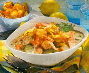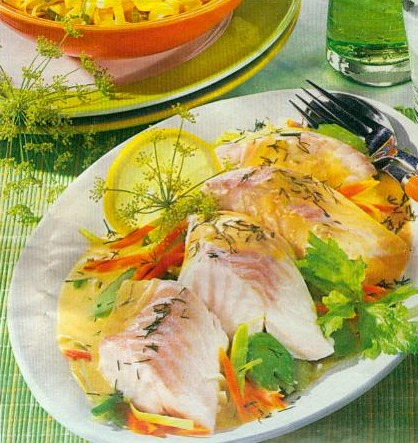 Kabeljaufilet waschen, Salzwasser aufkochen lassen und den Zitronensaft zugeben. Das Filet ca. 8 Minuten bei schwacher Hitze gar ziehen lassen. Abtropfen lassen und in Stücke teilen. Gewürzgurke in dünne Scheiben schneiden. Apfel schälen und das Kerngehäuse entfernen. Den Apfel in Spalten schneiden. Fenchelknolle putzen, waschen und in schmale Streifen schneiden. In einer Schüssel anrichten. Essig, heisse Brühe und Öl verrühren. Kräuter zufügen. Mit Salz und Pfeffer abschmecken.