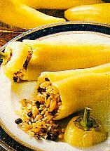 Zwiebeln, Knoblauch schälen, würfeln und im Öl glasig dünsten. Reis unterrühren. Wein und Wasser angiessen. Korinthen, Salz zufügen, aufkochen. Zugedeckt 20-25 Minuten garen lassen. Von dem Paprika am Stielansatz jeweils einen Deckel abschneiden. Kerne entfernen, Schoten waschen. Pinienkerne ohne Fett rösten. Kräuter abbrausen und hacken. Alles zum fertigen Reis geben, mit Gewürzen und Zitronenschale pikant abschmecken. Mischung in die Spitzpaprika füllen. Schoten samt Deckel in eine Pfanne geben, etwas Wasser angiessen. Zugedeckt ca. 30 Minuten bei mittlerer Hitze garen.