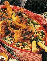 Suppengrün putzen. Mit Poularde, Lorbeer, Salz in einen Topf geben, knapp mit Wasser bedeckt 60 Minuten köcheln. Geflügel herausnehmen, etwas abkühlen lassen, dann Fleisch von den Knochen lösen und würfeln. Den Blumenkohl putzen. In Röschen teilen, waschen. In der Hühnerbrühe weich garen. Inzwischen Reis in Salzwasser quellen lassen. Die Hälfte des Blumenkohls mit 500 Milliliter der Brühe pürieren. Mit Salz, Pfeffer, Worcestersauce und Zitronensaft abschmecken. Die restlichen Blumenkohlröschen, Erbsen und Fleisch darin erhitzen. Zum Schluss Eigelb unterrühren. Reisrandform mit Butter fetten. Den Reis abgiessen und hineindrücken. Auf eine Platte stürzen. Ragout in die Mitte füllen und servieren.