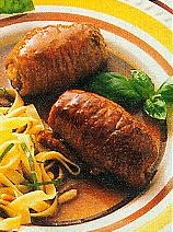 Rouladen mit Salz und Pfeffer von beiden Seiten würzen. Karotte schälen und vierteln. Geschälte Zwiebeln, eine Gurke, Kapern und Knoblauch klein hacken und alles mit Senf sowie Haferflocken vermischen. Mit Salz und Pfeffer würzen und auf die Rouladen streichen. Je 2 Scheiben Speck auf die Rouladen legen, mit einem Viertel Karotte und Gurke belegen und aufrollen. Mit Küchengarn fest zubinden und im Öl rundum anbraten. Mit der Brühe ablöschen und ca. 40 Minuten köcheln lassen, dabei die Rouladen häufig wenden.